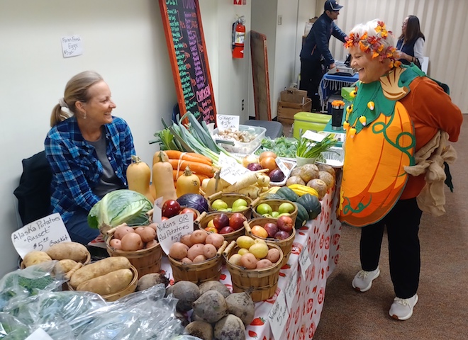 Burlington Standard Press, Nov. 6 – Vendor Kathy Hoffman (left) talks with Burlington Farmers Market Manager Carol Reed during a recent indoor market at the library. (Jason Arndt photo)