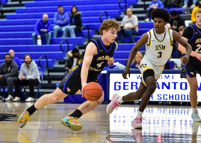 (Delavan Enterprise, Jan. 29, 2026) Delavan-Darien’s Haaken Hovestol (4) drives hard to the basket during an away game last week against University School of Milwaukee. Hovestol tied for a team-high 14 points, but the Comets lost the game, 68-52. (Sean McKean photo)