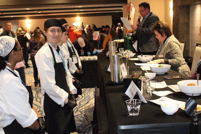 (Elkhorn Independent, Jan. 29, 2026) The second annual Pro-Am Culinary Showdown was held Sunday at Lake Lawn Resort in Delavan. The team from the Career and College Academy and Simple Food Ground brings their dish to the judges. (Jennifer Eisenbart photo)