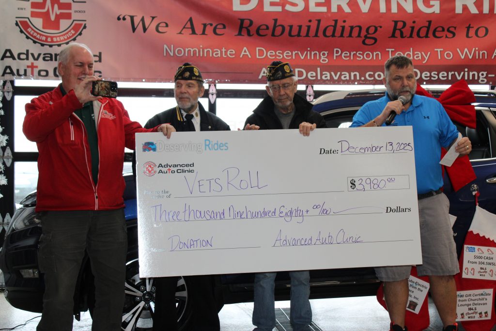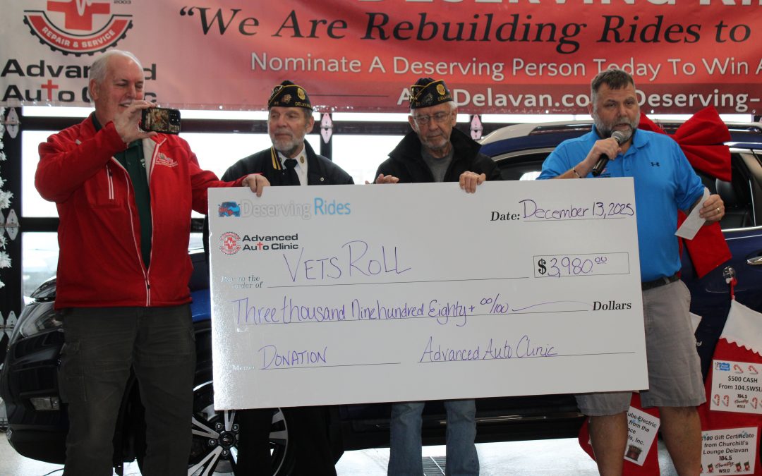 East Troy Times Jan. 9 – Advanced Auto Clinic, in addition to handing out its Deserving Rides winner, also presented donations to a number of different non-profit organizations, including VetsRoll, Breathe Inc., the Wisconsin Lions Camp. For Vets Roll are (from left) Mark Finnegan, local veterans Len Hahn and Larry Malsch and AAC owner Tony Lynn.