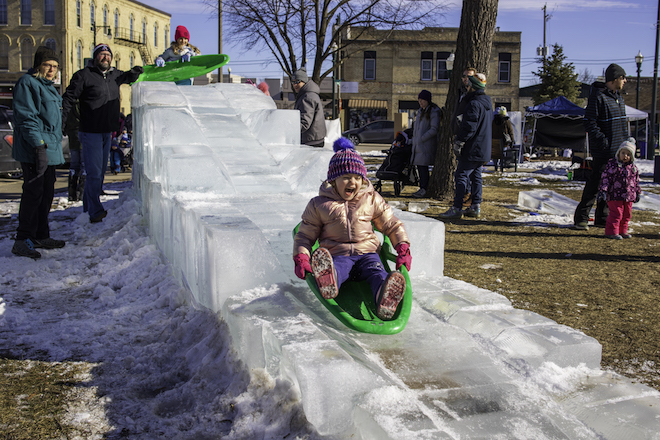 (Standard Press, Feb. 12, 2026) A girl enjoys the ice slide at Wehmhoff Square Park in Burlington on Feb. 7 as part of the Wisconsin State Ice Carving Championship. (Michael Stefanich Jr. photo)