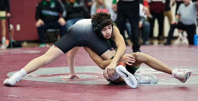 (Waterford Post, Feb. 12, 2026) Camyron Dennis, of Waterford, battles with Burlington’s Cash Vanderwerff during the 106-pound first-match at the Southern Lakes Conference meet. (Michael Stefanich Jr. photo)
