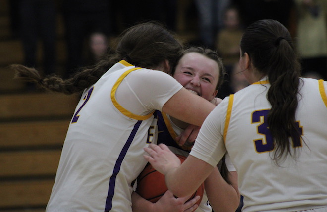 (Elkhorn Independent, March 5, 2026) Elkhorn senior Kyrin Lile hugs teammate Emilyn Bonow with Kenzie Pedersen coming to join them after clinching a regional title Feb. 28. (Jennifer Eisenbart photo)