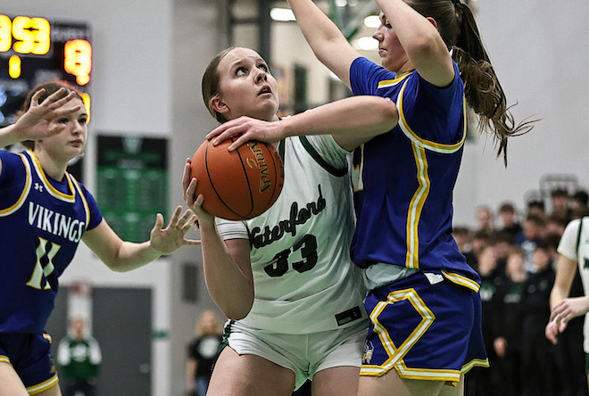 (Waterford Post, March 5, 2026) Sophia Milosh and the Waterford Union High School girls basketball team fell in overtime in the WIAA playoffs to New Berlin West. (Photo by Michael Stefanich Jr.)
